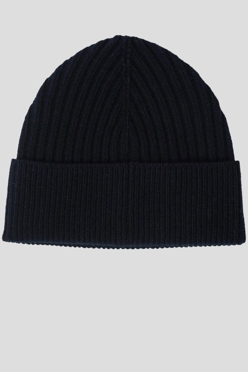 Детали: Мужская темно-синяя шапка из шерсти от Herno (Эрно). Дизайн в рубчик, модель бини, широкий отворот, патч-лого