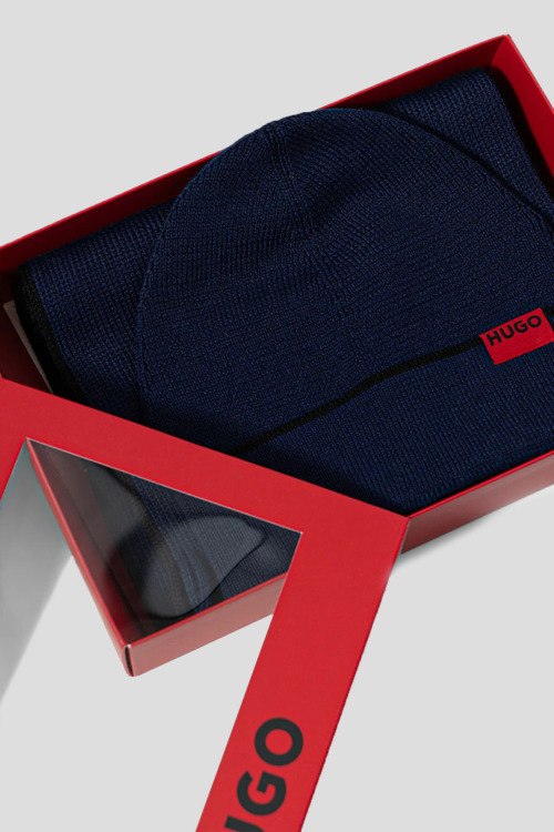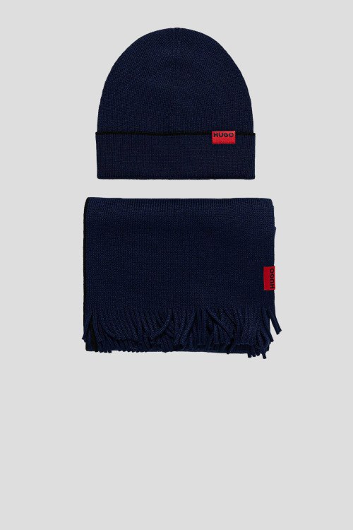 Детали: Мужской темно-синий комплект из акрила и шерсти от Hugo by Hugo Boss (Хуго бай Хуго Босс). Шапка бини: классическая вязка, нашивка с логотипом, широкий отворот. Шарф: нашивка с логотипом, края с бахромой. Размер шарфа: 23 x 190 см