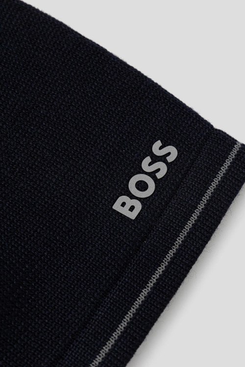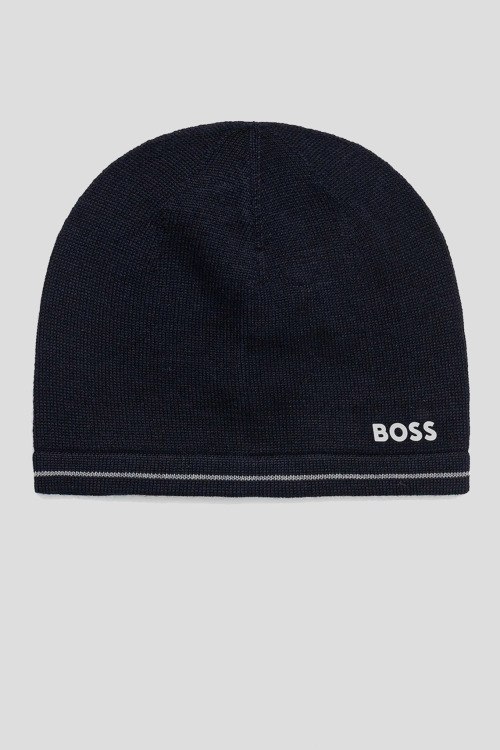 Детали: Мужская темно-синяя шерстяная шапка бини Arveso от Hugo by Hugo Boss (Хуго бай Хуго Босс). Классическая вязка, логотип, облегающий фасон
