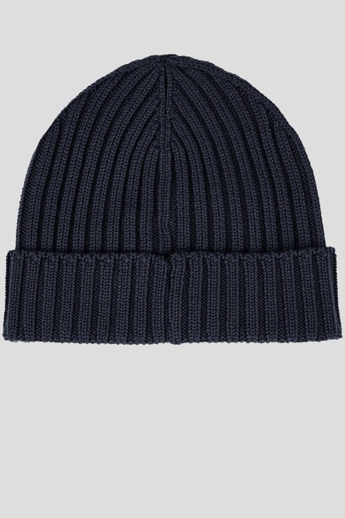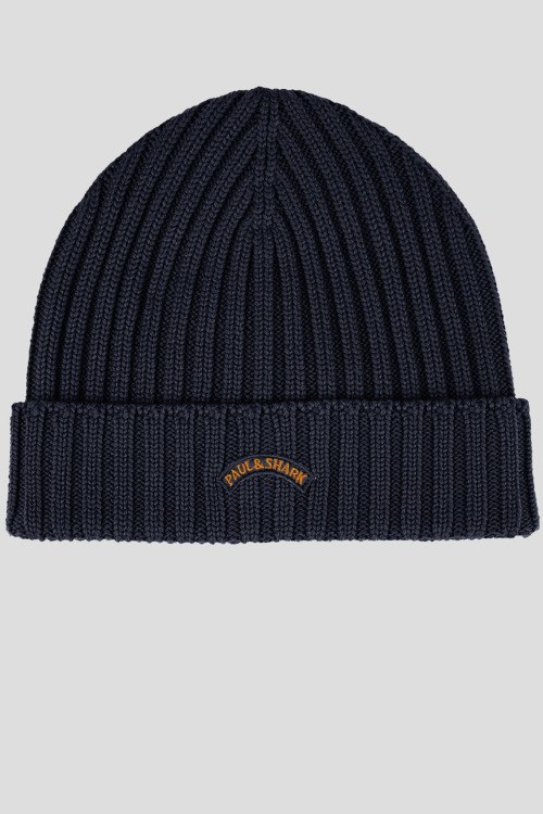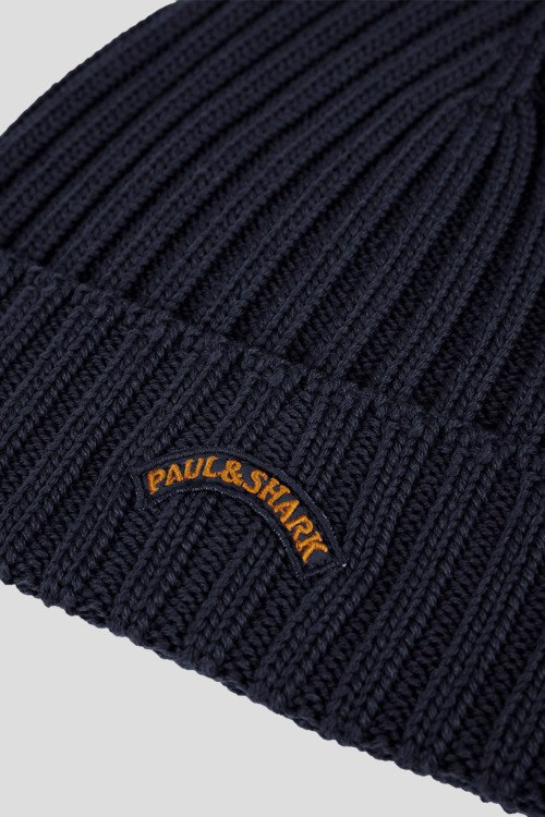 Детали: Мужская темно-синяя шерстяная шапка бини от Paul & Shark (Пол энд Шарк). Классическая вязка, нашивка с логотипом, широкий отворот