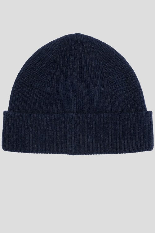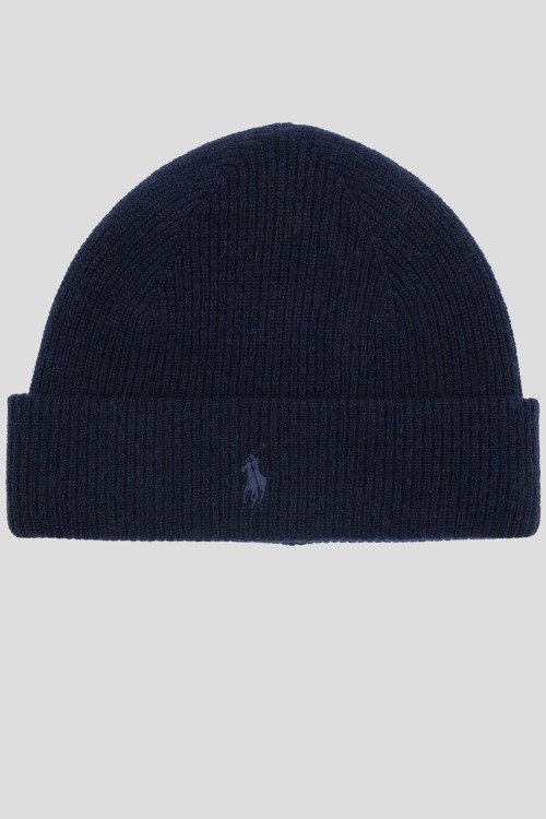 Детали: Мужская темно-синяя шапка из кашемира от Polo Ralph Lauren (Поло Ральф Лорен). Модель бини, широкий отворот, вышитый логотип бренда