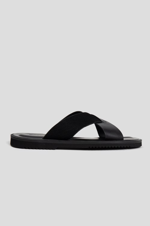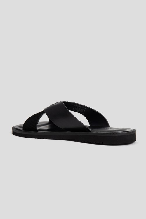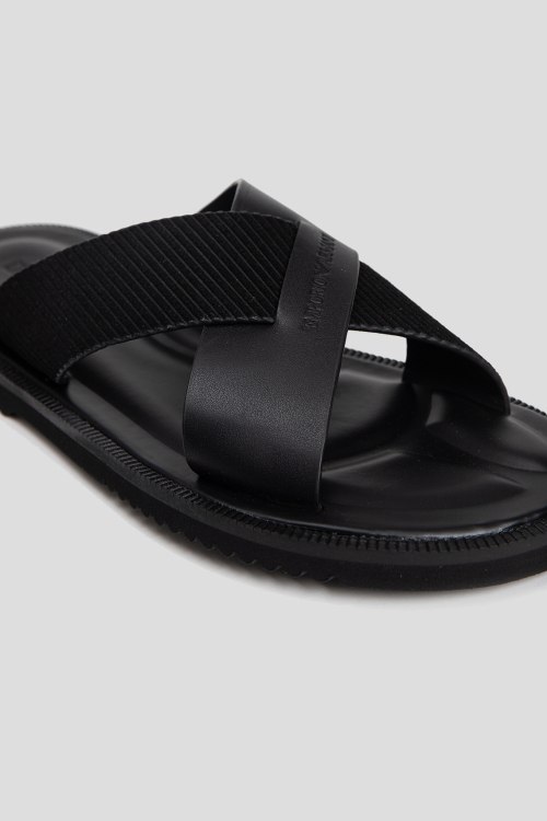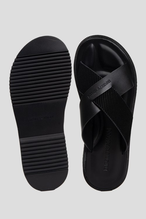 Детали: Мужские черные шлепанцы из кожи и замши от Armani (Армани). Спереди перекрестные ремешки, тиснение с логотипом бренда, анатомическая стелька