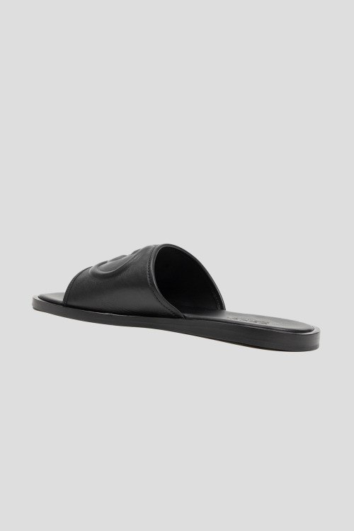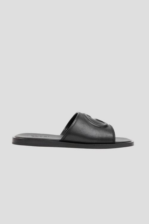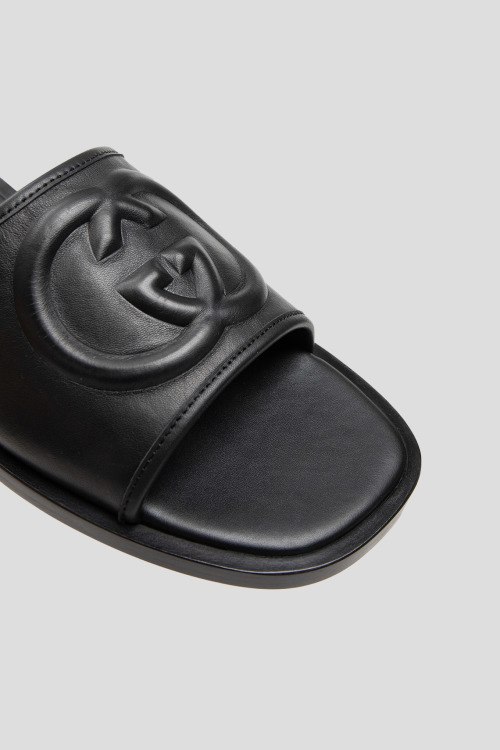 Мужские черные кожаные шлепанцы Interlocking G от Gucci (Гуччи). Модель из гладкой кожи, широкий ремешок с логотипом GG, носок формы мягкий квадрат, кожаная стелька с логотипом, плоская подошва