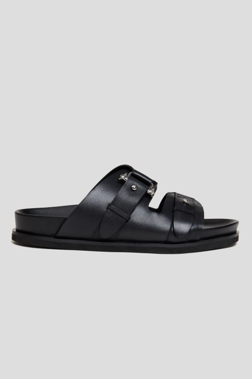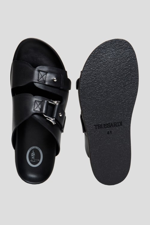 Детали: Мужские черные кожаные шлепанцы от Trussardi (Труссарди). Два широких ремешка с пряжками, серебристая фурнитура, стелька с логотипом, закругленный носок