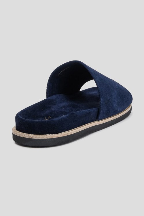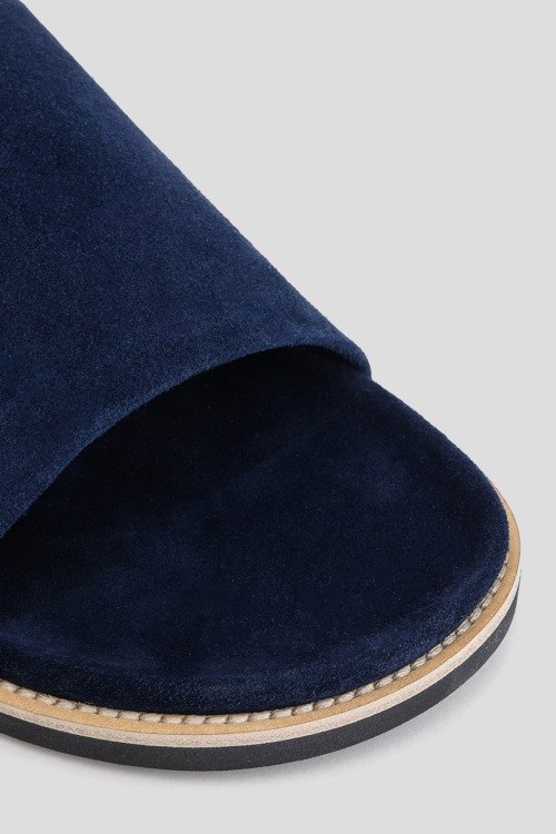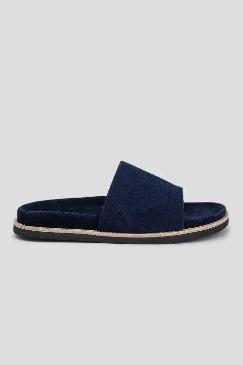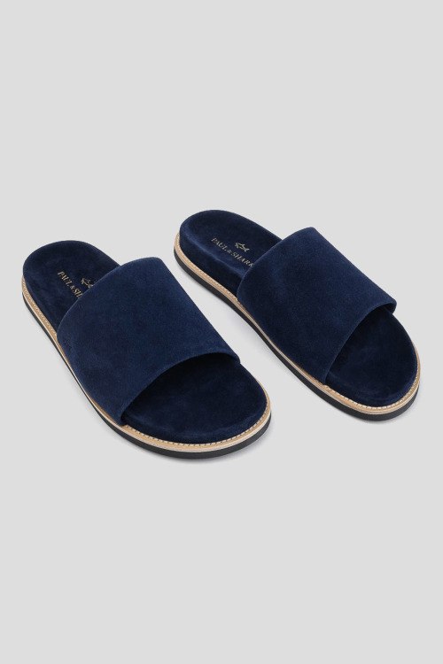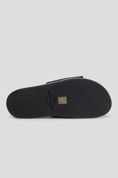 Детали: Мужские темно-синие шлепанцы из натуральной замши от Paul & Shark (Пол энд Шарк). Закругленный носок, широкий ремешок, анатомическая стелька, плоская подошва