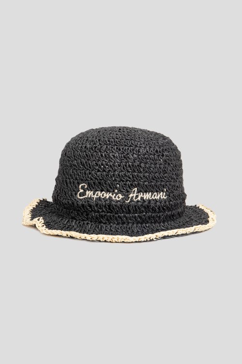 Детали: Женская черная шляпа из рафии от EA7 Emporio Armani (ЕА7 Эмпорио Армани). Плетенный дизайн, узкие поля с контрастной окантовкой, вышитый логотип бренда спереди