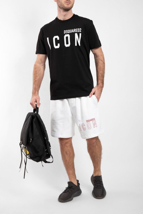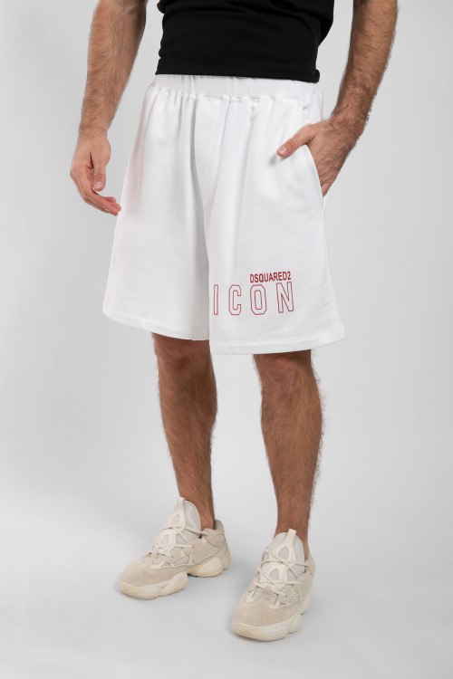 Мужские белые хлопковые шорты ICON от Dsquared2 (Дискваред). Эластичный пояс, боковые карманы, принт с логотипом.