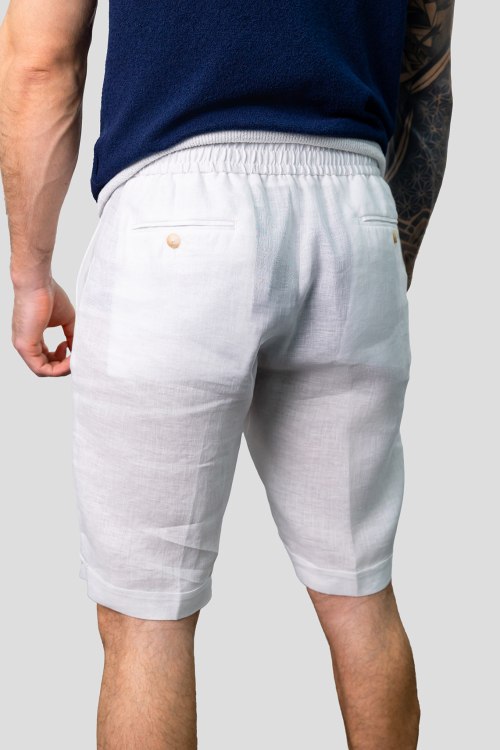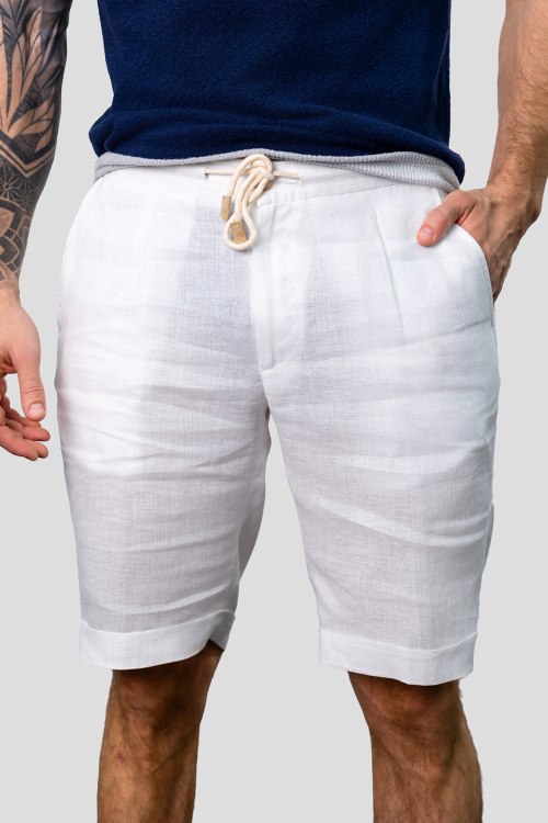 Детали: Мужские белые льняные шорты от Gran Sasso (Гран Сассо). Дизайн со стрелками, боковые и задние карманы, пояс на завязках и с петлями для ремня, сзади пояс на резинке, длина до колен