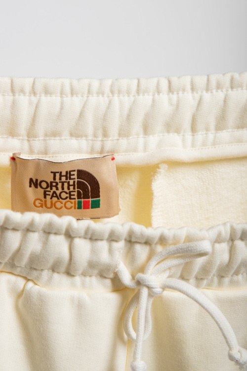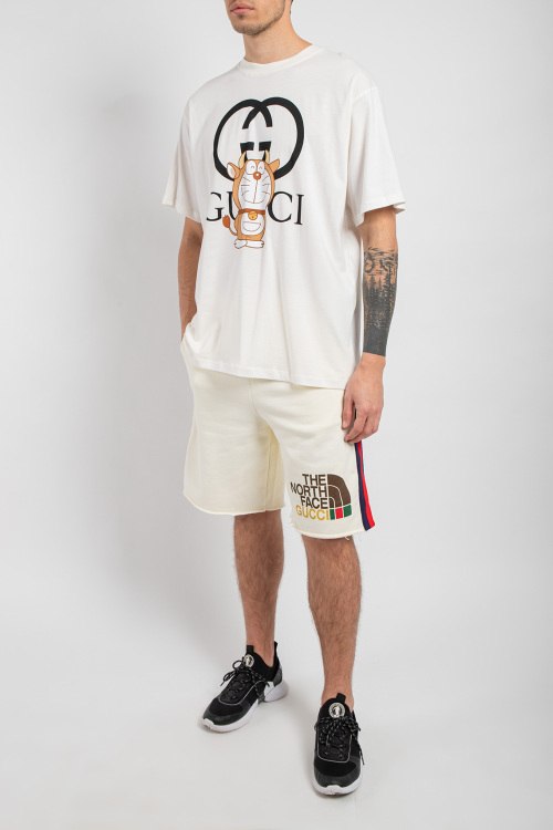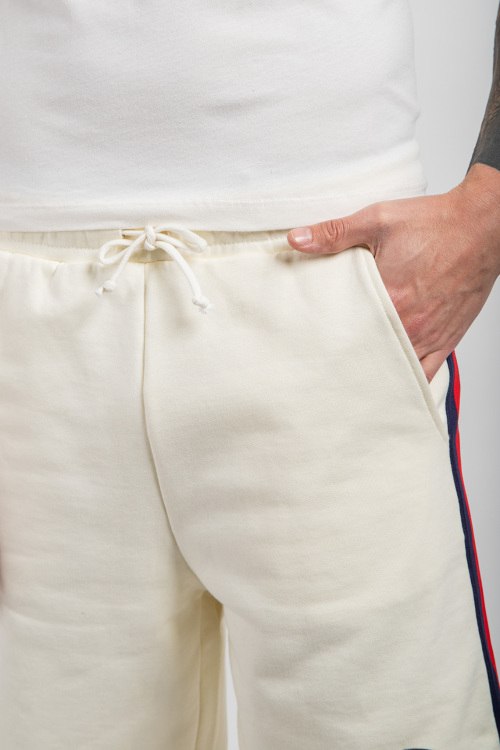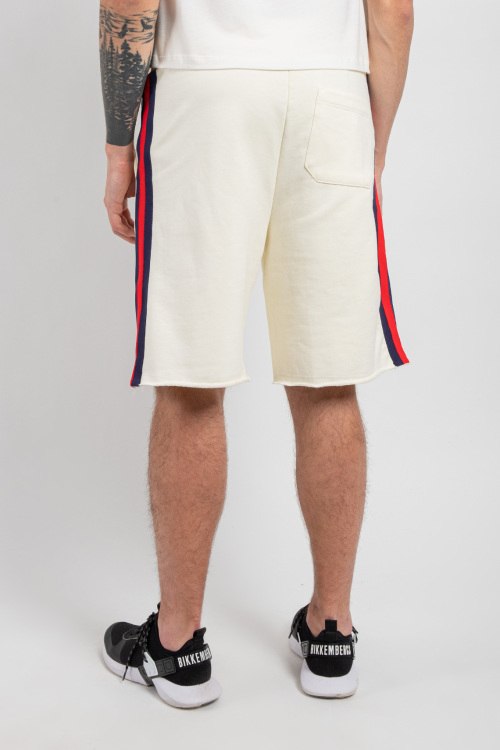 Детали: Мужские белые шорты из хлопка от Gucci (Гуччи). Длина до колена, эластичная резинка на поясе с кулиской, боковые и один задний карманы, дизайн с лампасами, принт с логотипом бренда