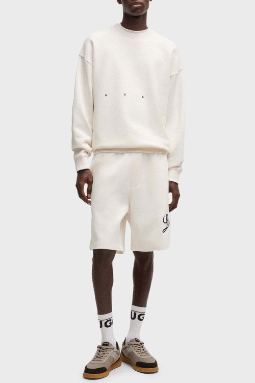 Детали: Мужские белые хлопковые шорты от Hugo by Hugo Boss (Хуго бай Хуго Босс). Эластичный пояс на завязках, боковые карманы, накладной карман сзади, принт с надписью