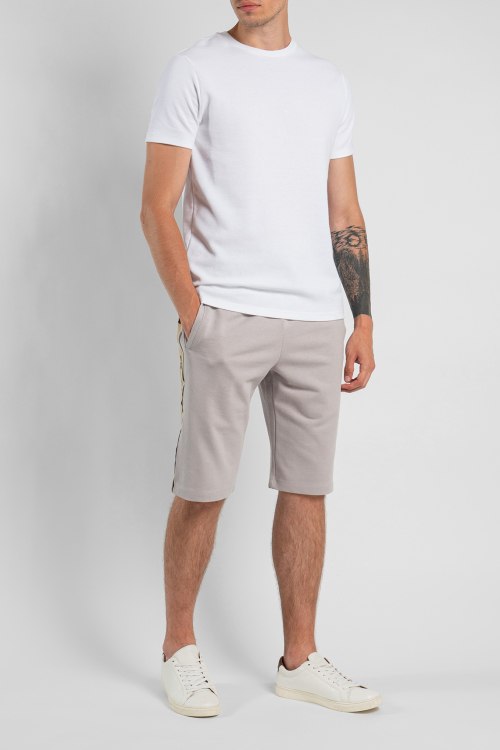 Мужские темно-бежевые хлопковые шорты от Gucci (Гуччи). Брендированные лампасы, боковые карманы, в поясе на трикотажной резинке.