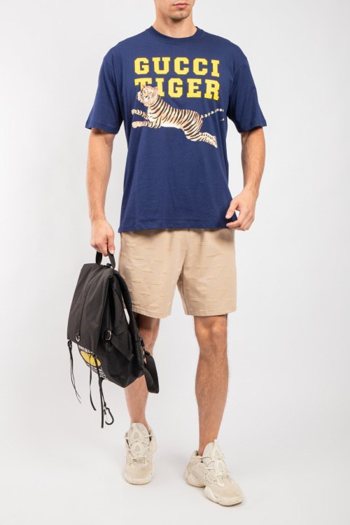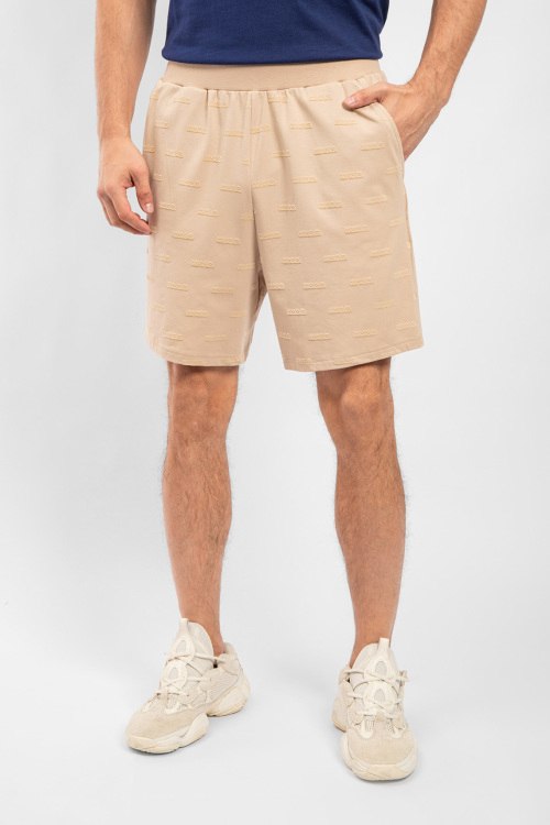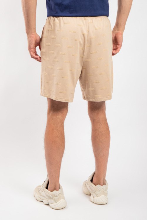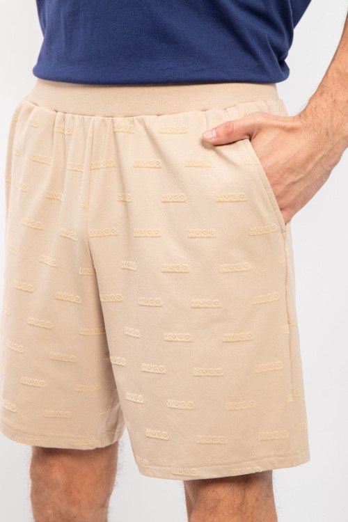Мужские бежевые хлопковые шорты от Hugo Boss (Хуго Босс). Вышитый логотип по всей поверхности, эластичный пояс, боковые карманы, длина до колен.