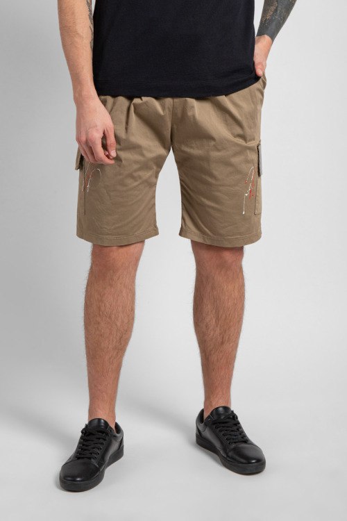 Мужские бежевые шорты-карго из хлопка от J.B4 Just Before (Джаст Бифо). Длина до колена высокая посадка пояса застёжка на молнию и пуговицу кулиска, боковые карманы, боковые накладные карманы с клапаном.