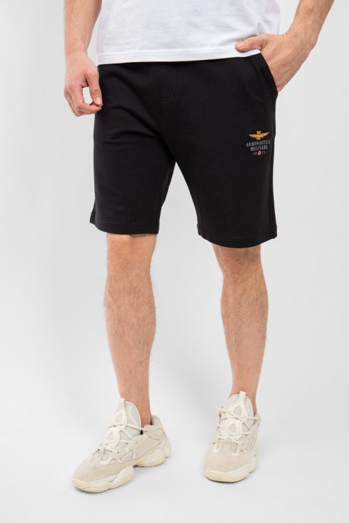 Мужские черные хлопковые шорты от Aeronautica Militare (Аэронавтика Милитари). Эластичный пояс на завязках, боковые карманы, вышитый логотип, длина до колен.