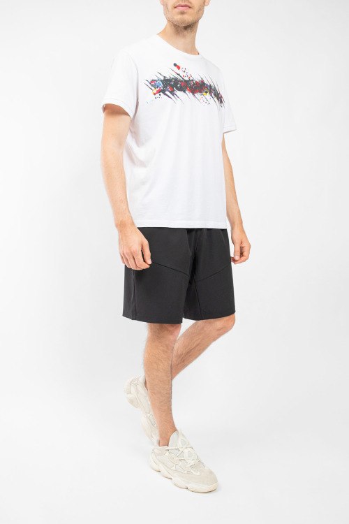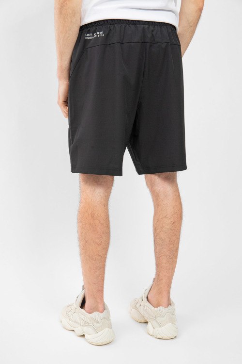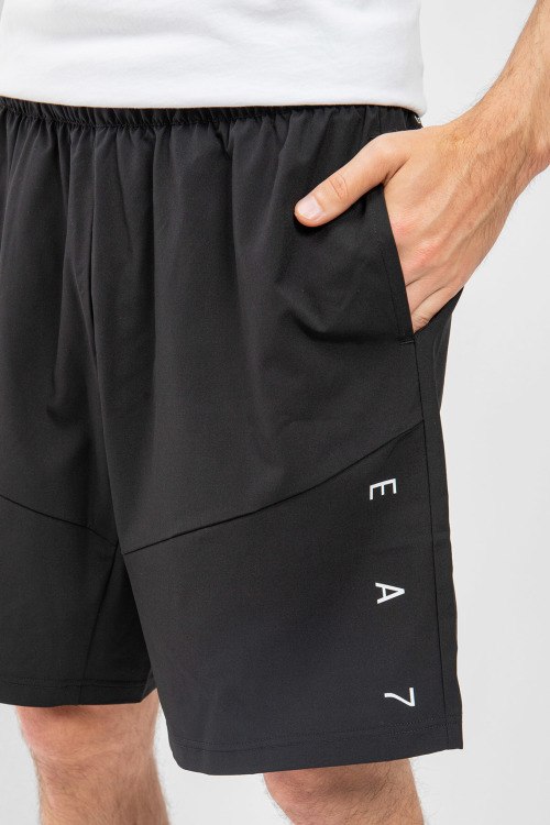Мужские черные шорты из полиэстера и эластана от EA7 Emporio Armani (ЕА7 Эмпорио Армани). Длина до колена, эластичная резинка на поясе, прорезные карманы, логотип бренда.