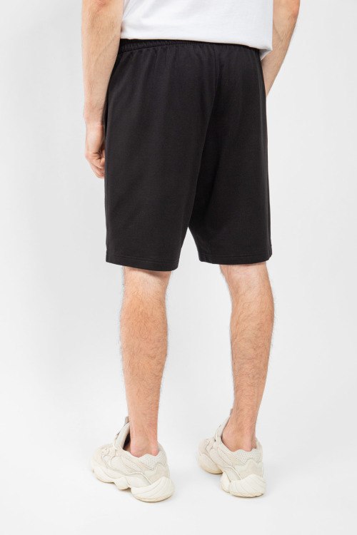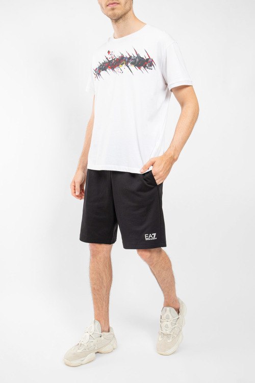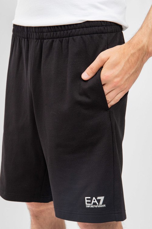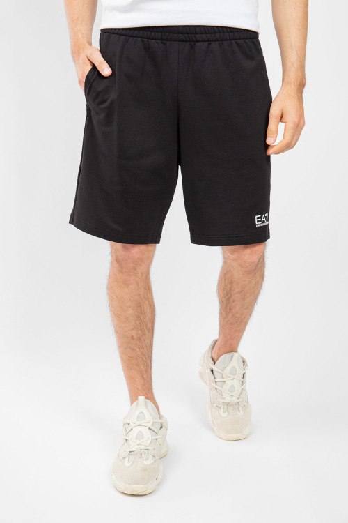Мужские черные спортивные шорты из хлопка от EA7 Emporio Armani (ЕА7 Эмпорио Армани). Свободный силуэт, эластичная резинка на поясе, прорезные карманы, прорезные карманы, логотип бренда.
