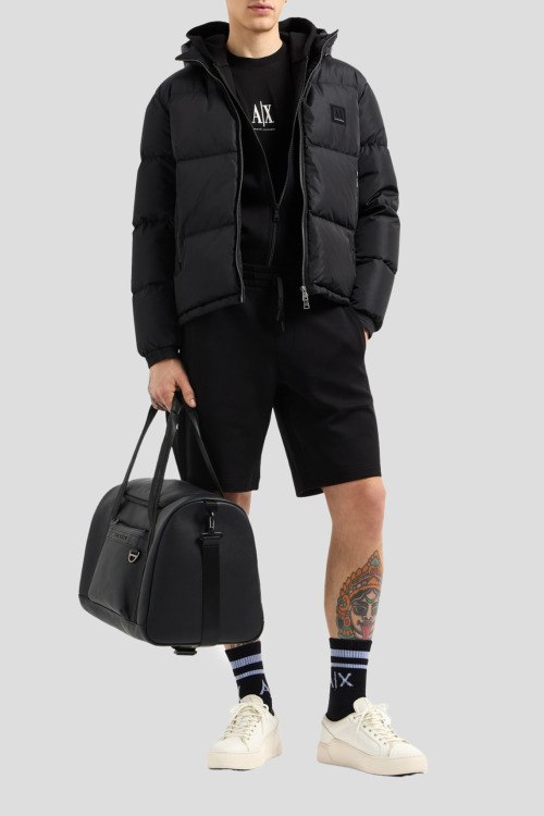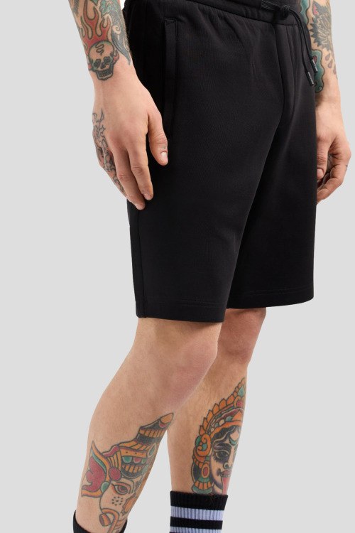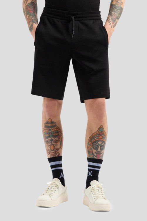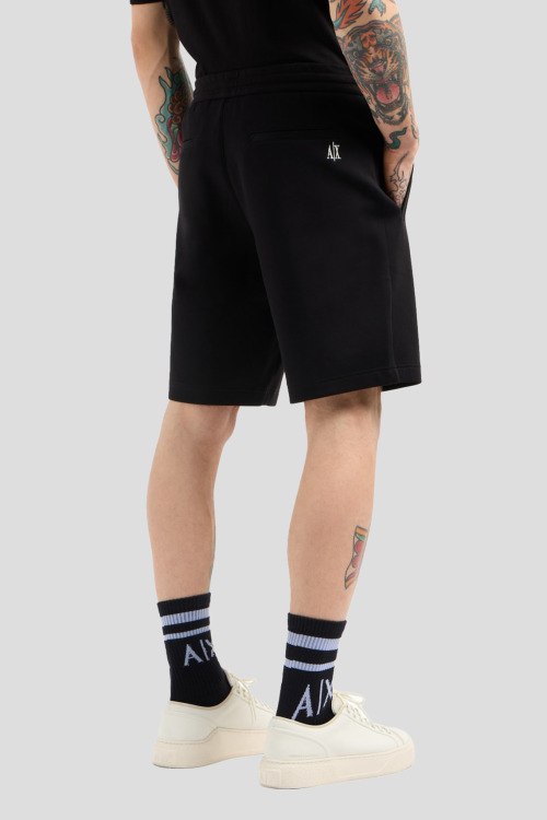 Детали: Мужские черные хлопковые шорты от Armani Exchange (Армани Эксчендж). Жластичный пояс на завязках, боковые карманы, карман сзади с логотипом, длина до колен