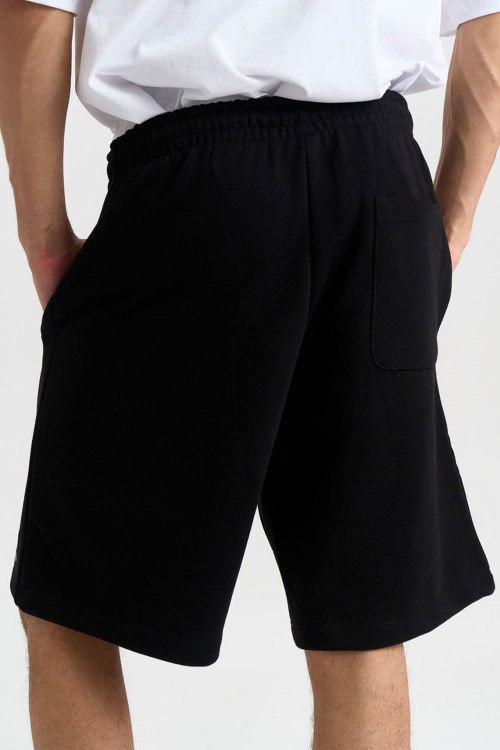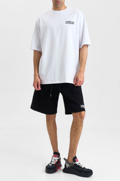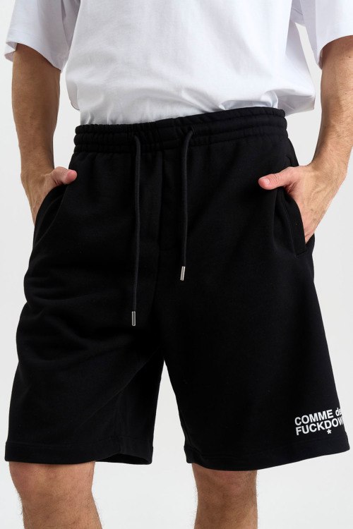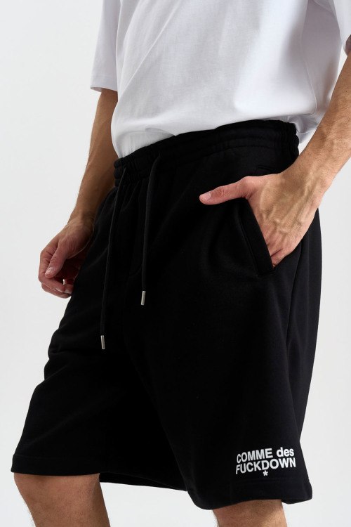Детали: Мужские черные хлопковые шорты от Comme des Fuckdown (Камм дес Факдаун). Эластичный пояс на завязках, боковые карманы, принт с логотипом, длина до колен. Параметры модели: 97 см - 78 см - 96 см. Рост - 188 см. Размер на фото - L