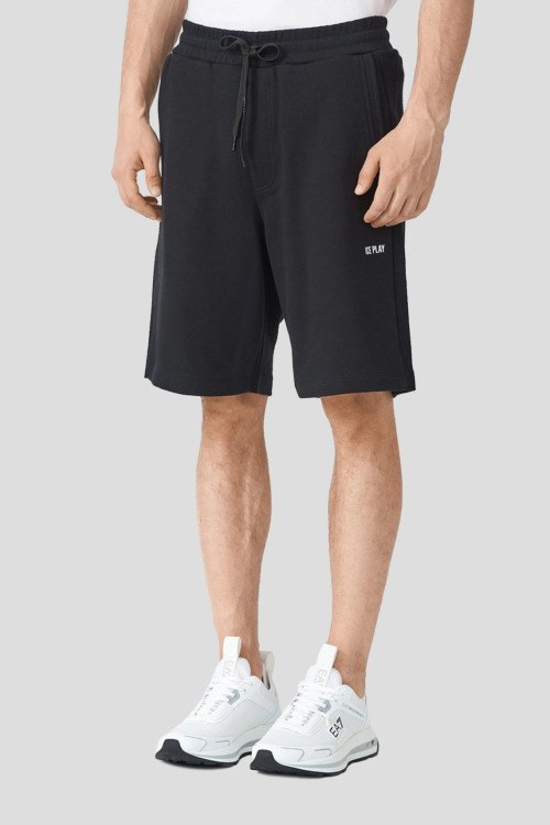 Детали: Мужские черные спортвиные шорты из хлопка от Ice Play (Айс Плей). Длина до колена, эластичная резинка на поясе с кулиской, прорезные карманы, свободный силуэт, логотип бренда