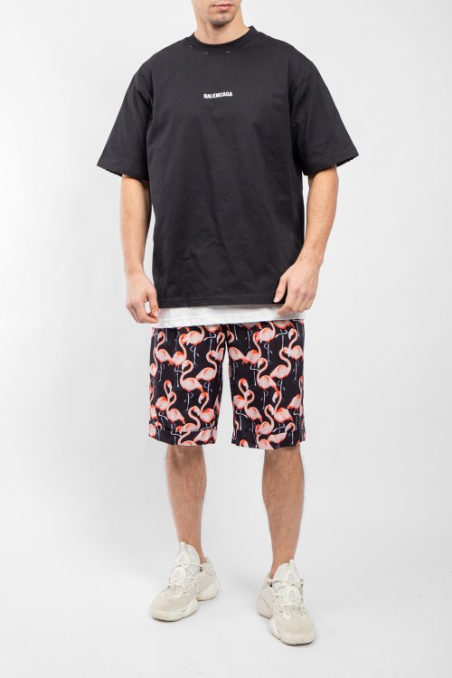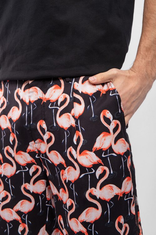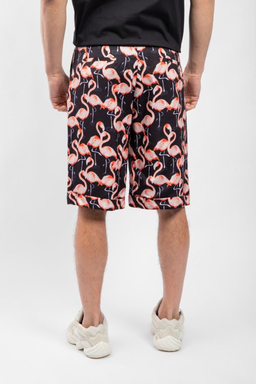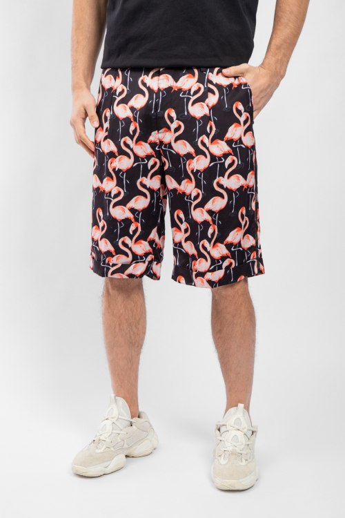 Мужские черные шорты из вискозы от Marc Jacobs (Марк Джейкобс). Принт с фламинго по всей поверхности, боковые и задние карманы, пояс с петлями для ремня, длина до колен.