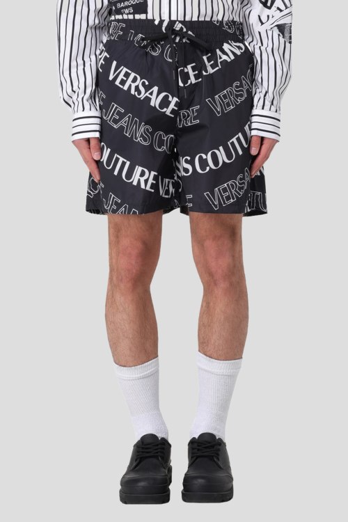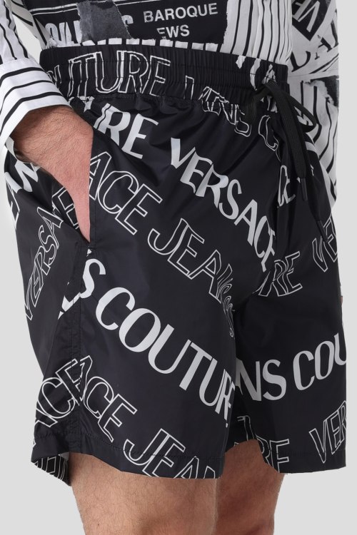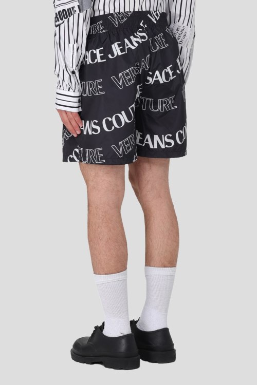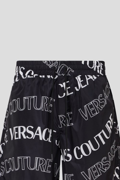 Мужские черные брюки из полиэстера от Versace Jeans Couture (Версаче Джинс Кутюр). Эластичная резинка на поясе, прорезные карманы, дизайн с брендированным принтом по всей поверхности изделия