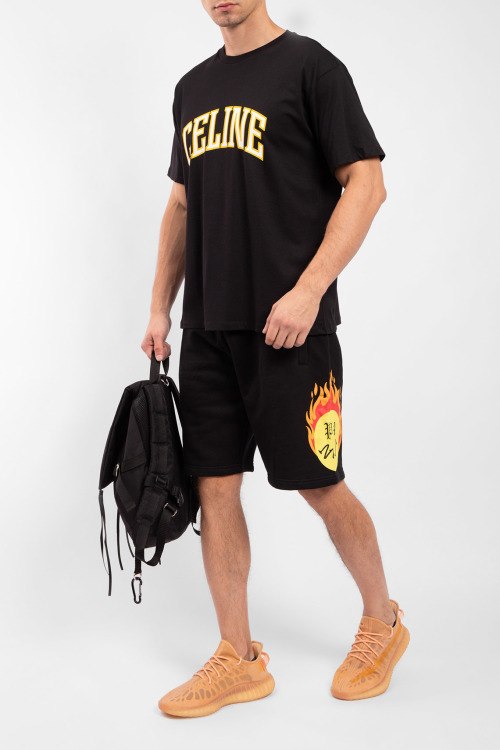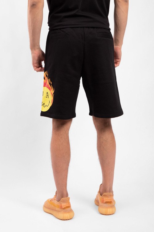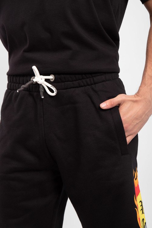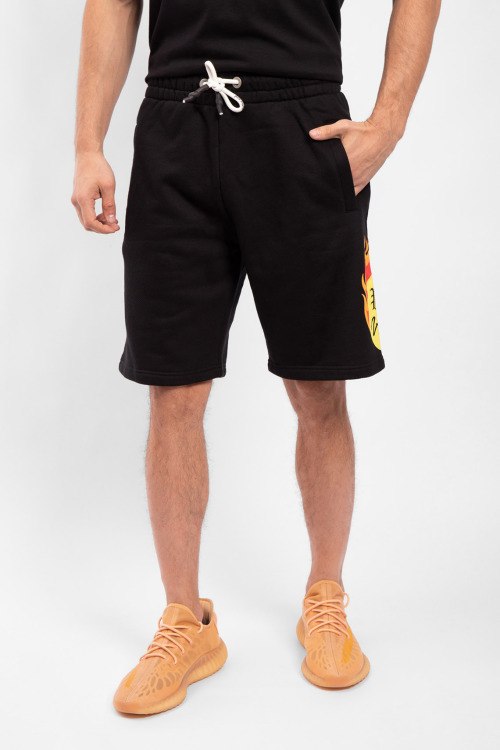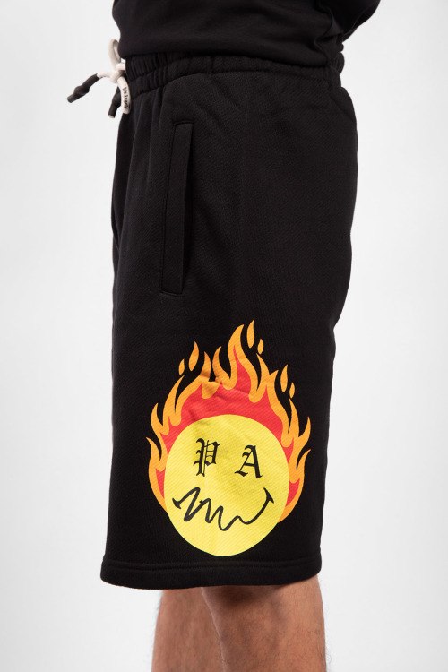 Мужские черные хлопковые шорты от Palm Angels (Палм Энджелс). Принт сбоку, эластичный пояс на завязках, боковые карманы, длина до колен.