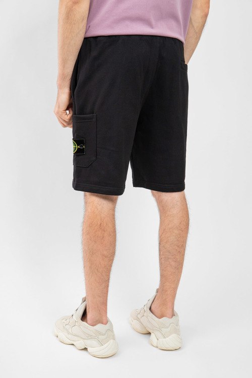 Детали: Мужские черные хлопковые шорты от Stone Island (Стоун Айленд). Эластичный пояс на завязках, боковые карманы, накладной карман с логотипом, длина до колен
