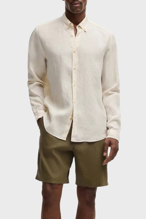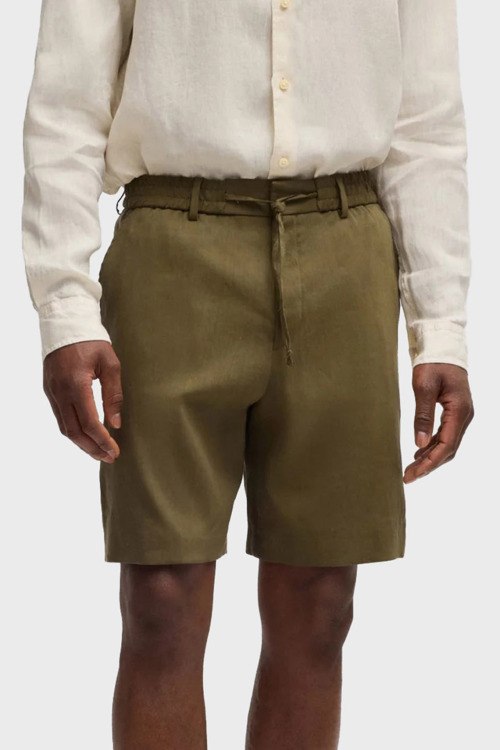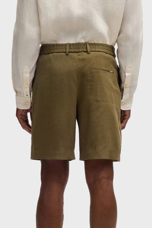 Детали: Мужские шорты цвета хаки из льна и вискозы P-Peter от Hugo Boss (Хуго Босс). Эластичный пояс на завязках, петли для ремня, боковые карманы, длина до колен