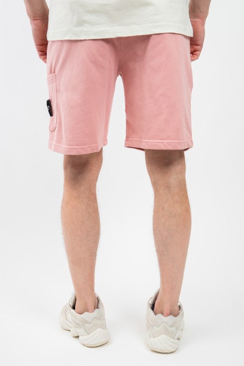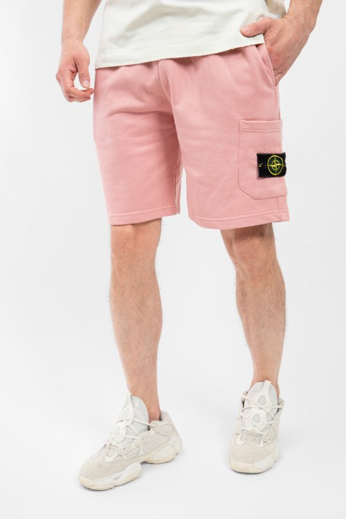 Детали: Мужские розовые хлопковые шорты от Stone Island (Стоун Айленд). Эластичный пояс на завязках, боковые карманы, накладной карман с логотипом, длина до колен
