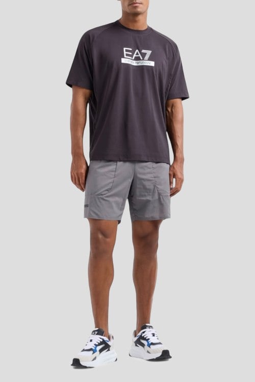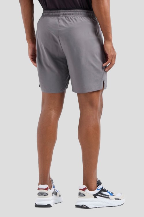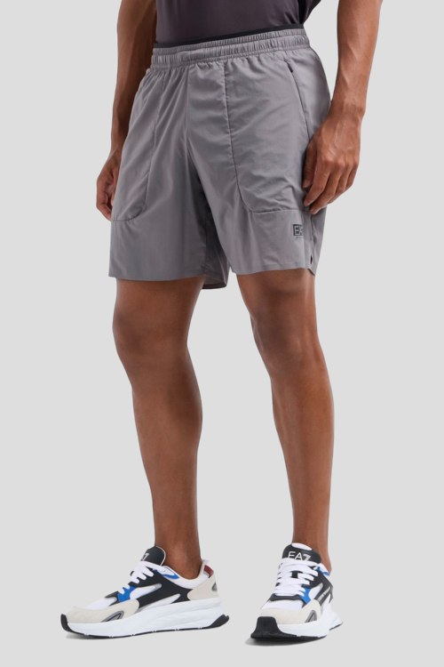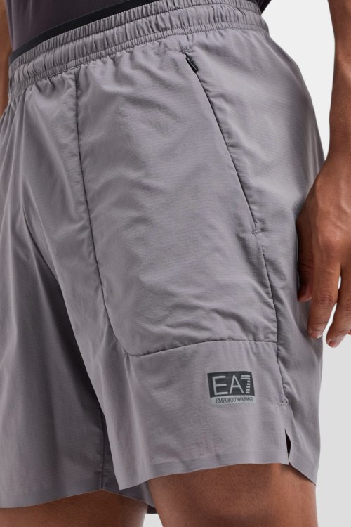 Детали: Мужские серые шорты Dynamic Athlete из технической ткани Ventus7 от EA7 Emporio Armani (ЕА7 Эмпорио Армани). Эластичный пояс, принт с логотипом, боковые карманы, длина выше колен