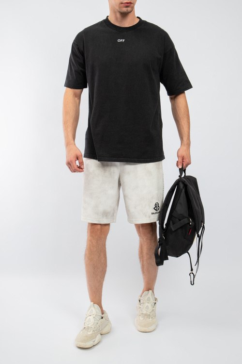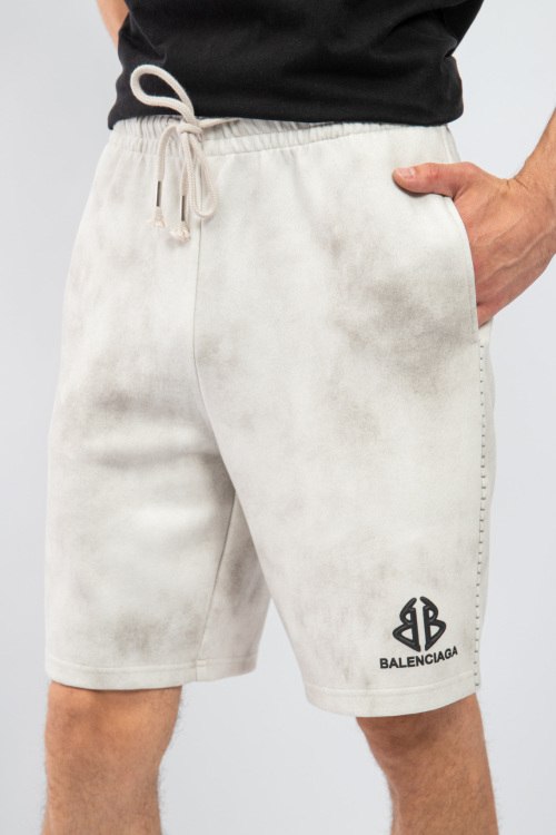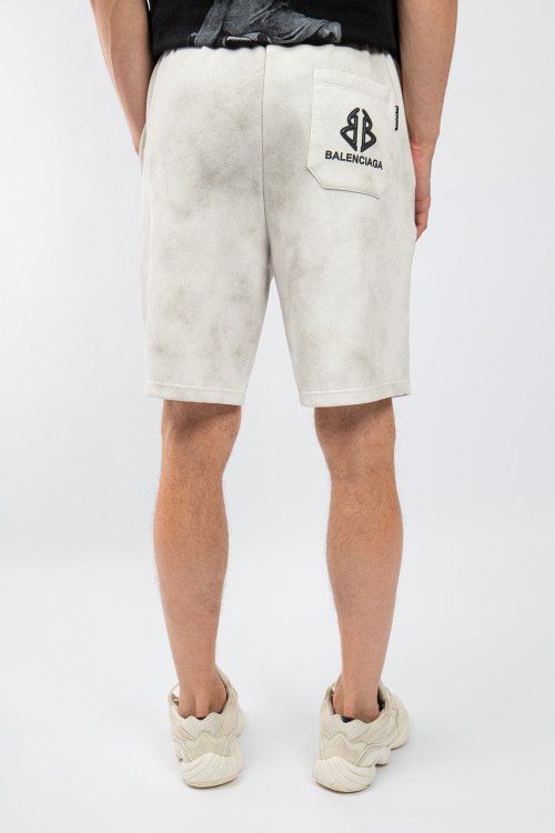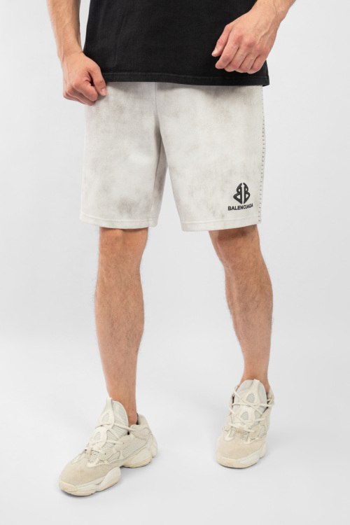 Мужские светло-серые хлопковые шорты от Balenciaga (Баленсиага). Эластичный пояс на завязках, боковые карманы, нашивка с логотипом, длина до колен.