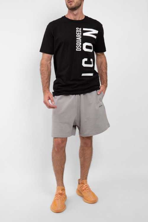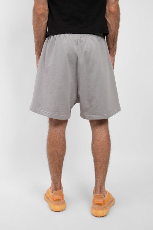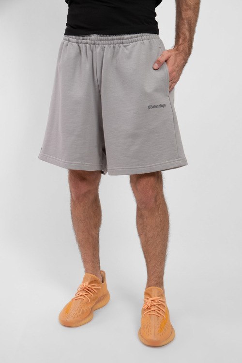 Детали: Мужские серые спортивные шорты из хлопка от Balenciaga (Баленсиага). Эластичная резинка в поясе, свободный силуэт, прорезные карманы, вышитый логотип бренда
