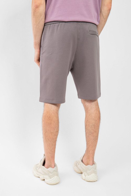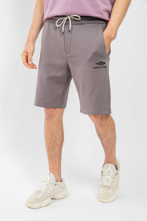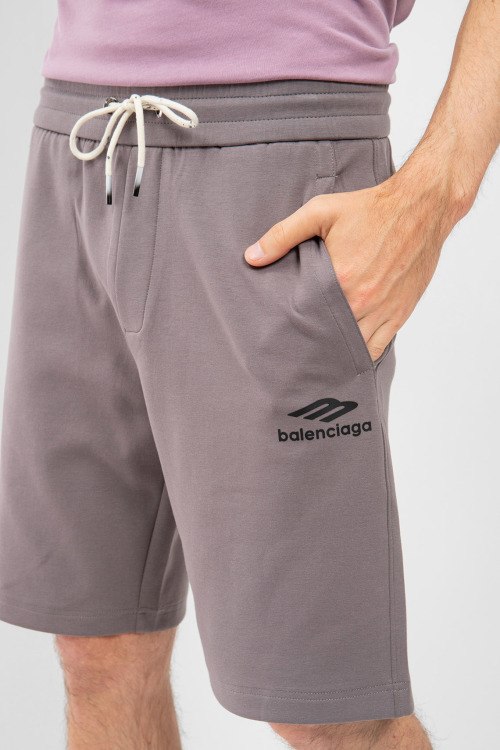 Мужские серые хлопковые шорты от Balenciaga (Баленсиага). Эластичный пояс на завязках, боковые карманы, принт с логотипом, длина до колен.