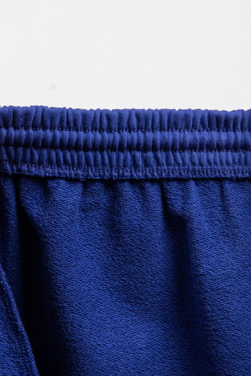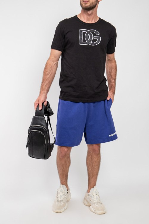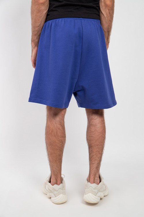 Мужские синие хлопковые шорты от Balenciaga (Баленсиага). Эластичный пояс, боковые карманы, принт с логотипом, длина до колен.