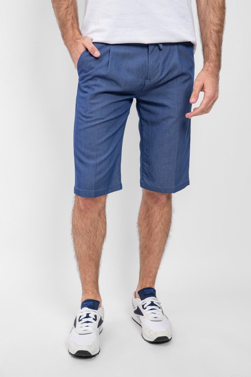 Мужские синие шорты из вискозы от Bernese (Бэрнизе Милано). Боковые и задние карманы, пояс с петлями для ремня и на завязках, нашивка с логотипом сзади на поясе, длина до колен.