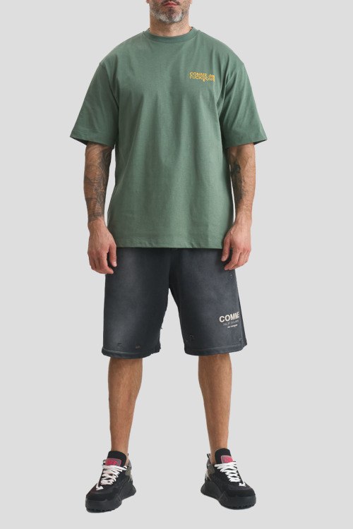 Детали: Мужские темно-серые хлопковые шорты от Comme des Fuckdown (Камм дес Факдаун). Дизайн с рваными деталями, принт с логотипом, эластичный пояс на завязках, боковые карманы, длина до колен