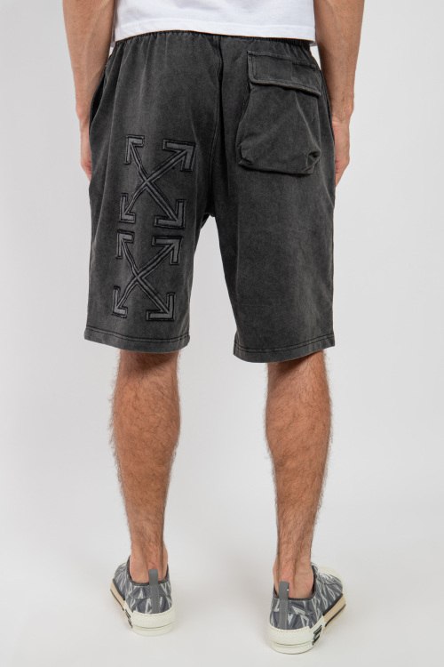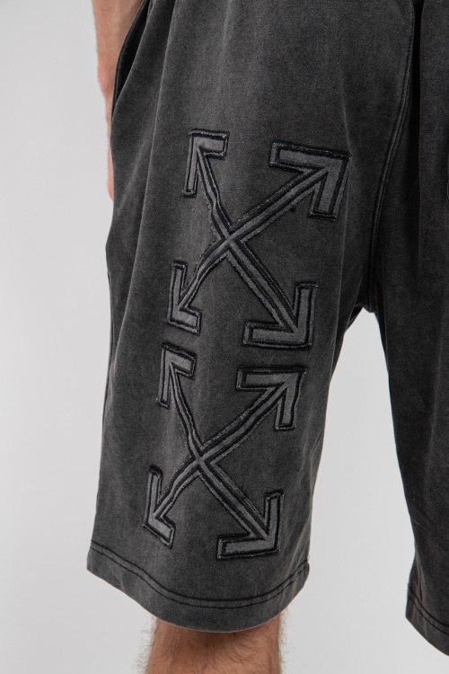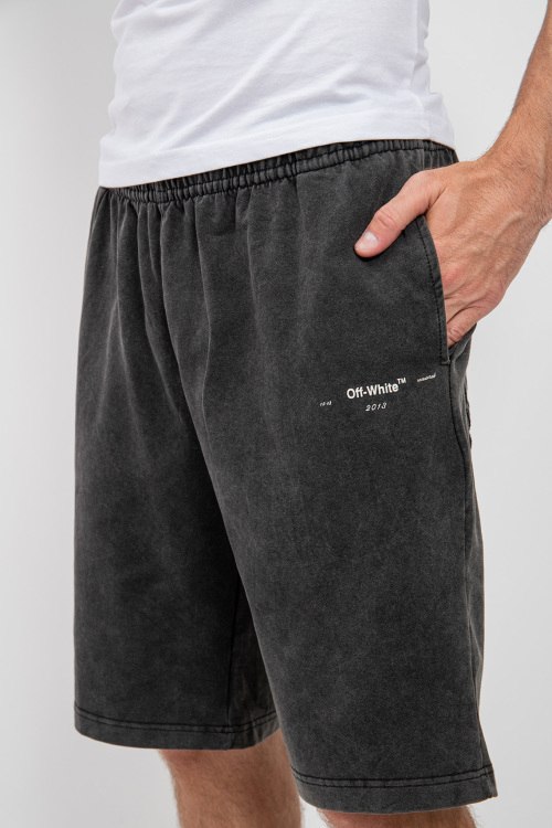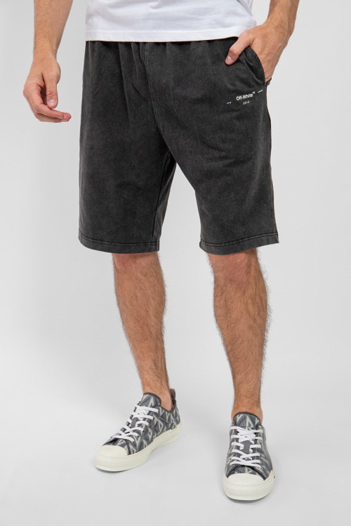 Мужские темно-серые хлопковые шорты от Off-White (Офф-Вайт). Эластичный пояс, боковые карманы, один карман сзади, принт с логотипом, нашивка с логотипом сзади, длина до колен.