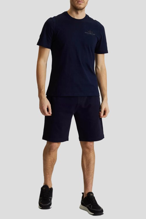 Детали: Мужские темно-синие хлопковые шорты от Aeronautica Militare (Аэронавтика Милитари). Эластичный пояс на завязках, принт с логотипом, боковые карманы, длина до колен