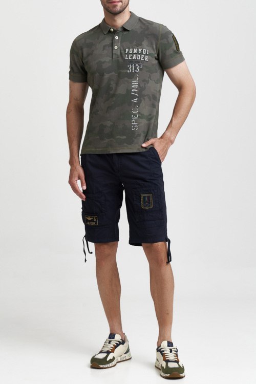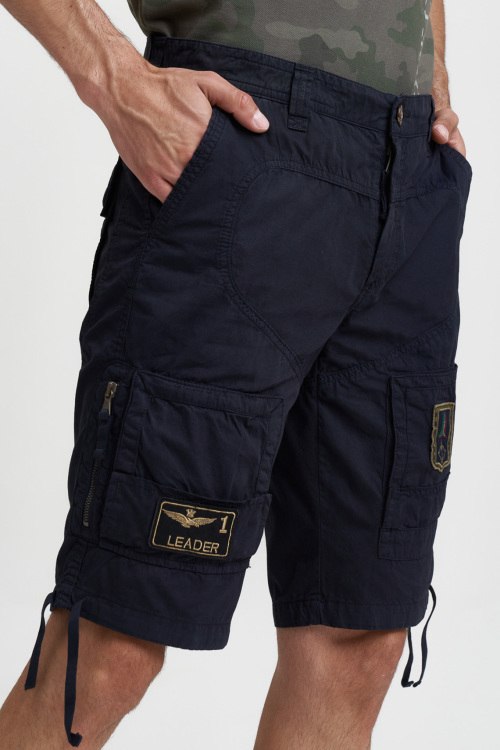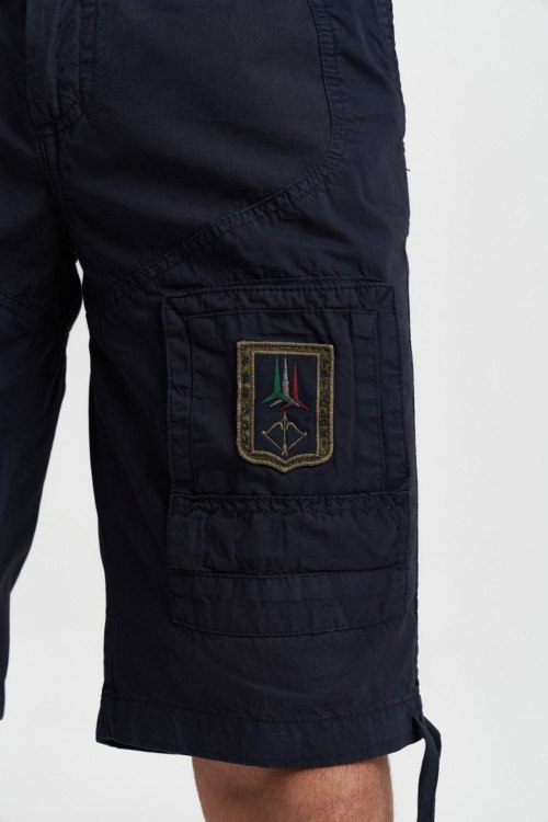 Детали: Мужские темно-синие шорты из хлопка от Aeronautica Militare (Аэронавтика Милитари). Длина до колена, регулируемая ширина с помощью кулиски по низ изделия, застежка на молнию и пуговицу, петля в поясе для ремня, два прорезных и два накладных кармана сзади, патчи "Leader 1" и "Frecce Tricolori" на перевернутых карманах спереди