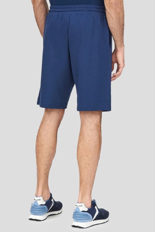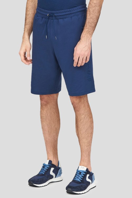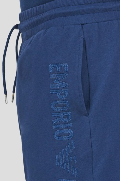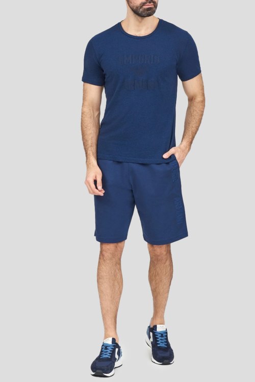 Детали: Мужские темно-синие хлопковые шорты от Emporio Armani (Эмпорио Армани). Эластичный пояс на завязках, боковые карманы, вышитый логотип, длина до колен