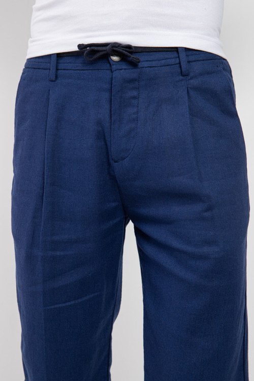 Мужские темно-синие шорты из льна и вискозы от Bernese (Бэрнизе Милано). Боковые и задние карманы, пояс с петлями для ремня и на завязках, нашивка с логотипом сзади на поясе, длина до колен.