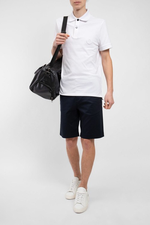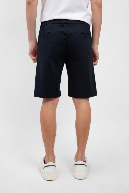 Мужские темно-синие шорты из хлопкового микса от Bikkembergs (Биккембергс). Длина до колена, средняя посадка, застежка на молнию и пуговицу, четыре кармана, петли в поясе для ремня, вышитый логотип бренда.