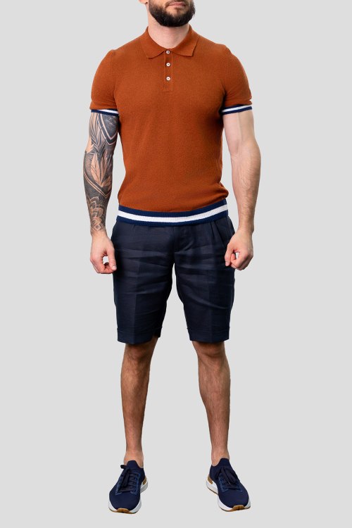 Детали: Мужские темно-синие льняные шорты от Gran Sasso (Гран Сассо). Дизайн со стрелками, боковые и задние карманы, пояс на завязках и с петлями для ремня, сзади пояс на резинке, длина до колен