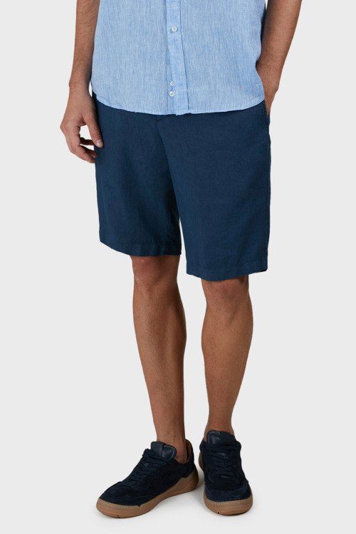 Детали: Мужские темно-синие шорты из льна от Paul & Shark (Пол энд Шарк). Эластичная резинка на поясе, застежка на молнию и пуговицу, петли в поясе для ремня, длина до колена, петли в поясе для ремня, патч-лого