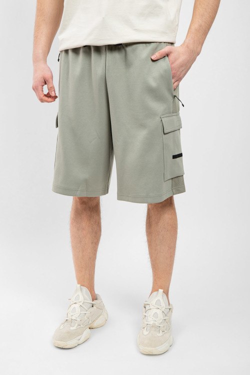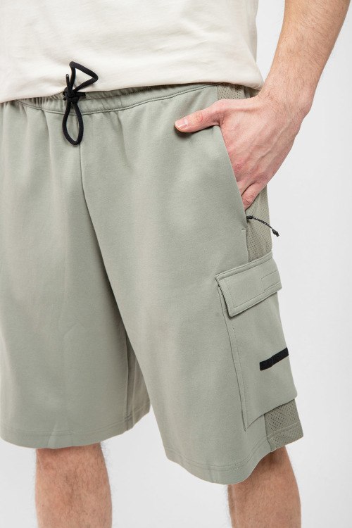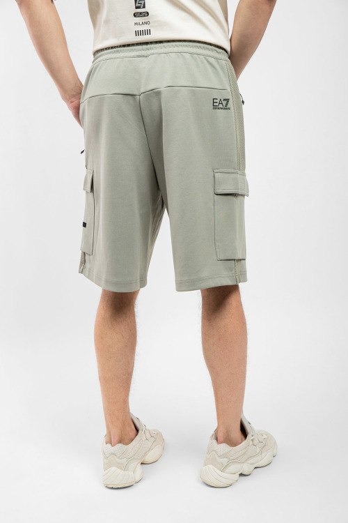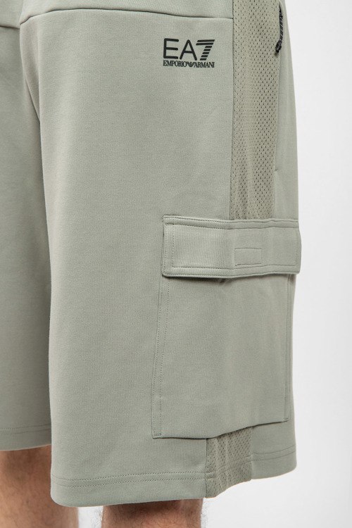 Мужские зеленые шорты из хлопкового микса от EA7 Emporio Armani (ЕА7 Эмпорио Армани). Длина до колена, эластичная резинка на поясе с кулиской, прорезные карманы, два накладных кармана с клапаном, логотип бренда.