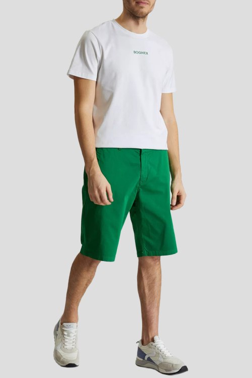 Детали: Мужские зеленые хлопковые шорты Miami от Bogner (Богнер). Боковые и задние карманы, пояс с петлями для ремня, нашивка с логотипом сзади на поясе, длина до колен