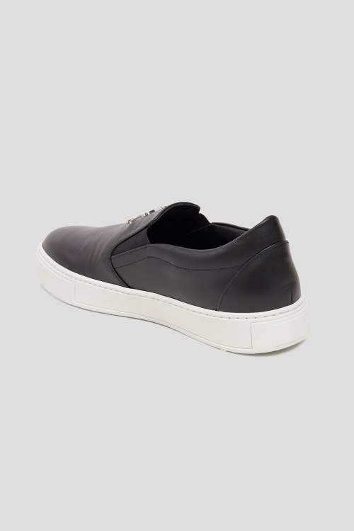 Детали: Мужские черные слипоны из натуральной кожи от Philipp Plein (Филипп Плейн). Закругленный носок, по бокам эластичные вставки, логотип бренда спереди, резиновая подошва белого цвета