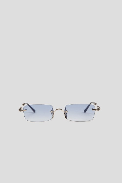 Детали: Мужские солнцезащитные очки от Chrome Hearts (Хром Хартс). Серебристые дужки с золотистыми деталями, прямоугольная форма, светлая линза с градиентом. Комплектация: чехол, салфетка, коробка, пакет. Размеры: 55*20*144