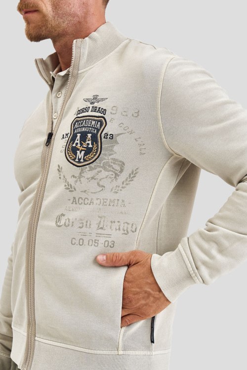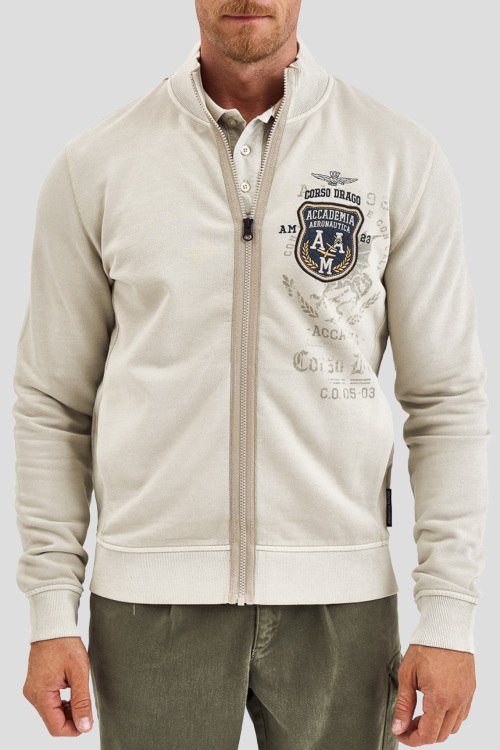 Детали: Мужской бежевый хлопковый кардиган Corso Drago от Aeronautica Militare (Аэронавтика Милитари). Классическая длина, высокий воротник-стойка, застежка на молнию, длинные рукава, прорезные боковые карманы, дизайн с принтом, вышивка на груди