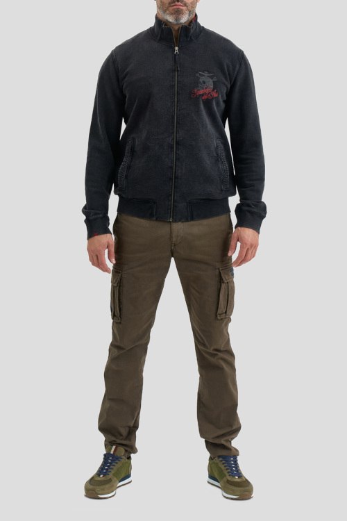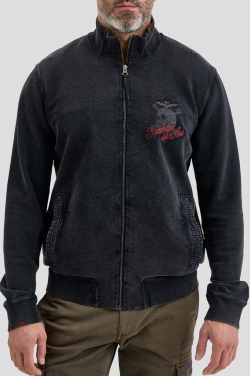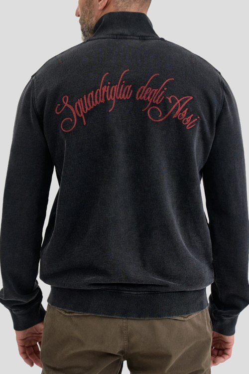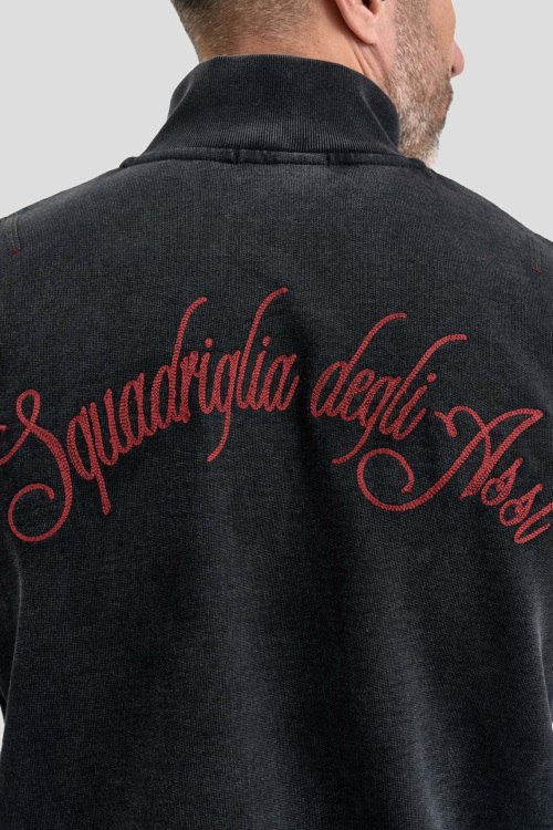 Детали: Мужская черная спортивная кофта Squadriglia Degli Assi из хлопка от Aeronautica Militare (Аэронавтика Милитари). Классическая длина, высокий воротник-стойка, застежка на молнию, модель декорирована вышивкой на спине и на груди, трикотажная резинка на манжетах и по низу изделия